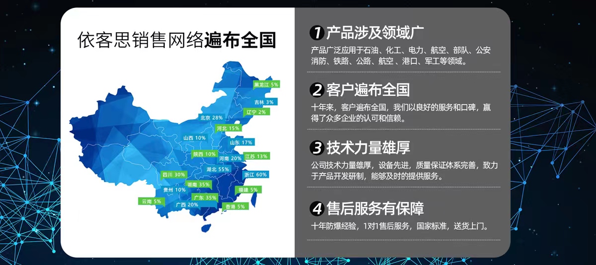 依客思防爆專注于防爆產(chǎn)品的研發(fā)、生產(chǎn)與銷售,主要產(chǎn)品有:防爆操作柱、BXCQ防爆靜電釋放儀、BZC系列防爆操作柱、不銹鋼現(xiàn)場操作箱、BXM(D)防爆照明(動(dòng)力)配電箱、BXX防爆檢修箱、BXJ防爆接線箱、LED防爆燈、防爆管件、防爆風(fēng)機(jī)等產(chǎn)品,型號規(guī)格齊全,廣泛適用于煤炭、電力、醫(yī)藥、石油、化工、航空等領(lǐng)域。我公司產(chǎn)品質(zhì)量過硬,價(jià)格實(shí)惠,銷售范圍廣,且與各大型企業(yè)建立了良好的合作關(guān)系,同時(shí)還遠(yuǎn)銷中、東亞和北美等地區(qū),深受用戶喜愛與青睞。